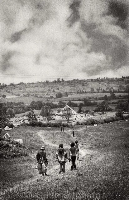 “I was born and grew up in Street, and remember clearly being told that my father was duty doctor at the Pilton festival and that we could all go as a family. I was 12 and my sister about 9. We were worried that this was going to be an open air classic noise....BUT we arrived at The farm to see a sea of hippies and people dancing clothed and many naked and we just knew this was going to be fun...our father went off to do what he had to do and left my sister and I to explore and to meet back at the farm house in two hours...we walked through the field of people and tents...all canvas and small...and a few homemade wigwams. The music was loud and I can’t really remember who was playing...however I did become a big T Rex fan...so I think maybe this was where I first heard them...we saw and I still remember to this day a young man as naked as the day he was born with a chicken on his shoulder...just walking and no one taking any notice...We later met up in the farm kitchen and it was full of people coming and going, we had fresh milk and warm biscuits...there were several trays of biscuits and people just walked in and took them....and huge jugs of milk too...Micheal Eavis was charming. We stayed there for most of the day and late into the night.
